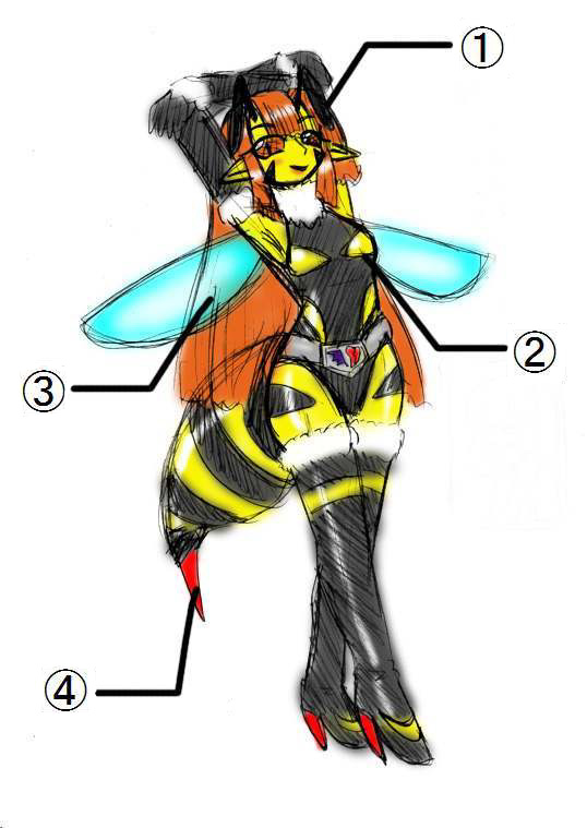 @触覚:高感度センサーになっており、"エキドナ"の"神託"をどこにいても聞くことが出来る。 A胸:濃厚な蜂蜜を製造できる。蜂蜜は、魔娘人たちの体力を回復したり 捕らえた人間の体を魔物の魂と同調しやすい体質に変えたり出来る。 B羽:空を素早く飛べる。 また、すり合わせることにより催眠音波も放つことが出来る。 C針:麻痺毒や、淫毒などさまざまな毒を蜂の腹部で生成する。 また、人間を一時的に簡易蜂魔娘人に変える毒も生成できる。 |